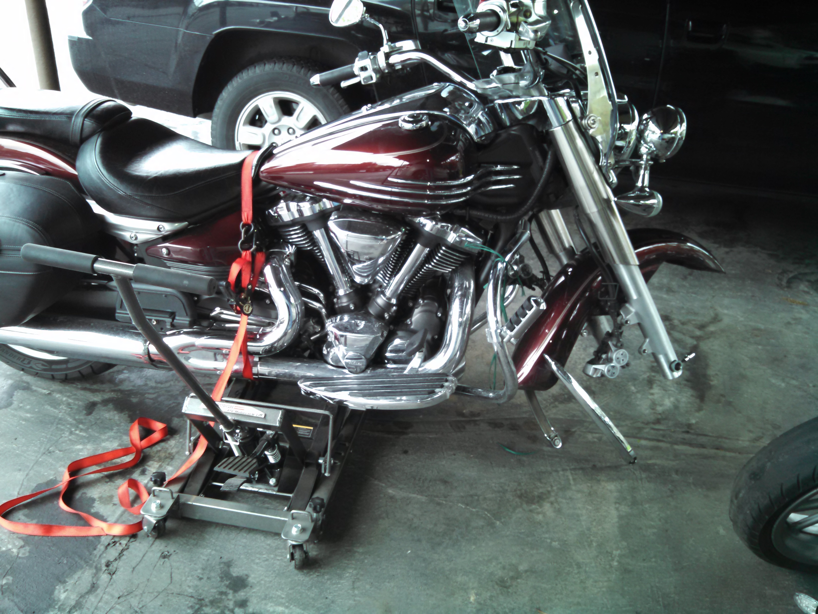 IMG_20150523_093506_285 (1)I set up, ready to work on the motorcycle this morning. Jack in place, tools lined up, and schedule set. I wanted to have the front wheel off and at the door of the shop the moment they opened to have the new tire mounted and balanced.