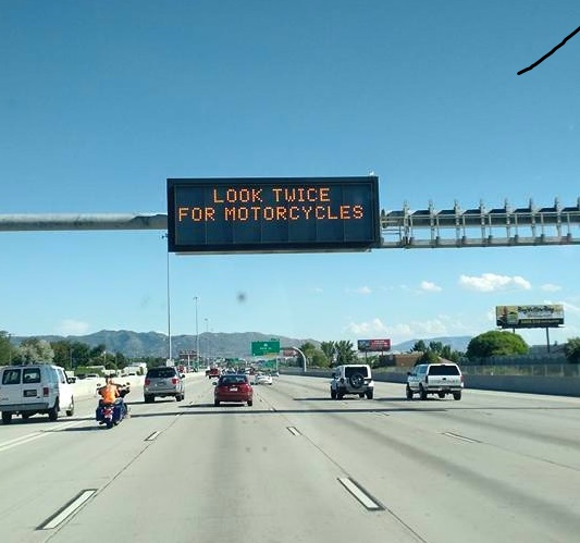 The next sign spanning the highway was a highway alert reading “Look Twice for Motorcycles.”